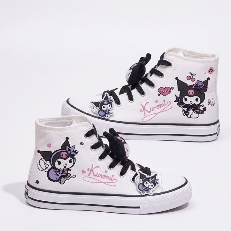 Les Converse Kuromi incarnent l’esprit espiègle et rebelle de l’anti-héroïne préférée de l’univers Sanrio. Ces sneakers montantes style high-top se déclinent en blanc pur ou noir intense, chacune ornée d’illustrations exclusives de Kuromi en différentes poses : version diablesse avec queue et trident, version sorcière avec chapeau pointu et balai, accompagnée d’étoiles violettes et de la signature manuscrite rose “Kuromi”. L’élément distinctif ? Un charm peluche Kuromi noir et blanc fixé aux lacets qui apporte une dimension tactile et collectible à ces sneakers cultes.