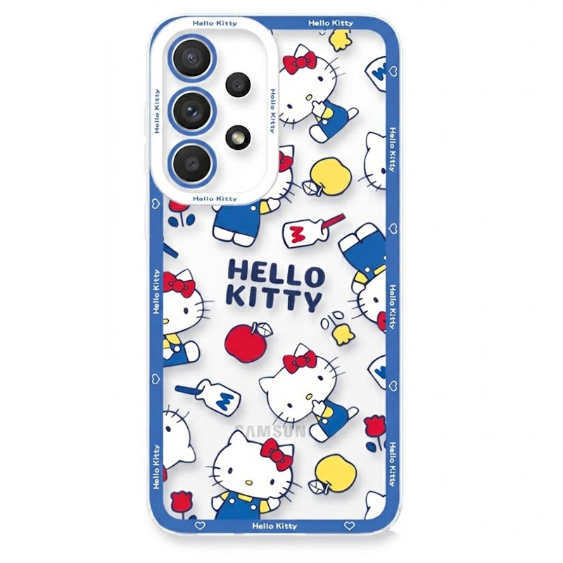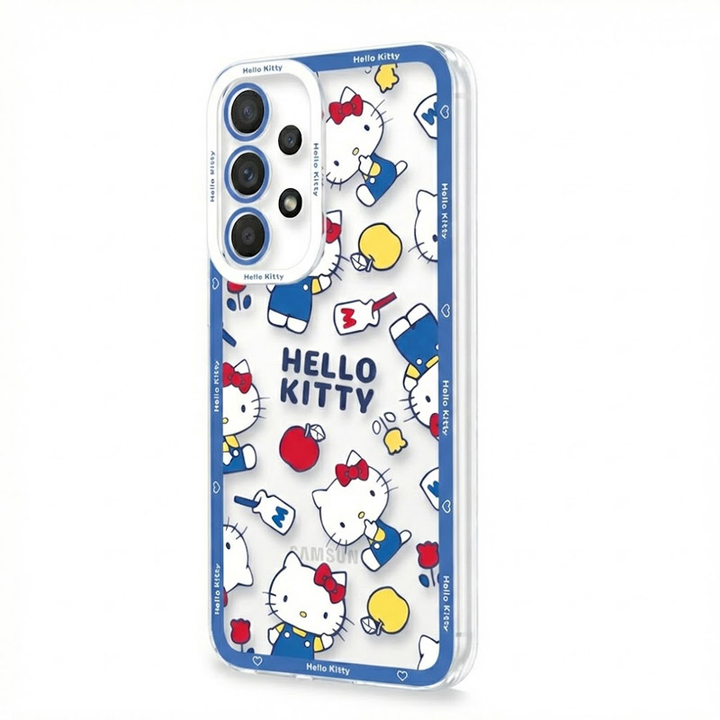 Cette coque Hello Kitty Samsung revisite le design originel du personnage avec un motif all-over généreux : Hello Kitty apparaît dans sa salopette bleue iconique sous plusieurs angles et tailles différentes, créant un effet de planche d’illustrations dynamique sur toute la surface. Les couleurs sont fidèles à la palette historique bleu cobalt de la salopette, rouge vif du nœud, jaune du nez, blanc pur du visage avec une impression nette qui conserve des contours francs même sur les plus petites silhouettes. Entre les personnages, des éléments signature complètent la composition : pomme rouge croquée, biberon de lait, tulipe rouge et logo “HELLO KITTY” en lettres capitales bleues au centre de la coque. Le fond transparent laisse apparaître le dos de votre Samsung et son logo, intégrant le design du téléphone à l’illustration.