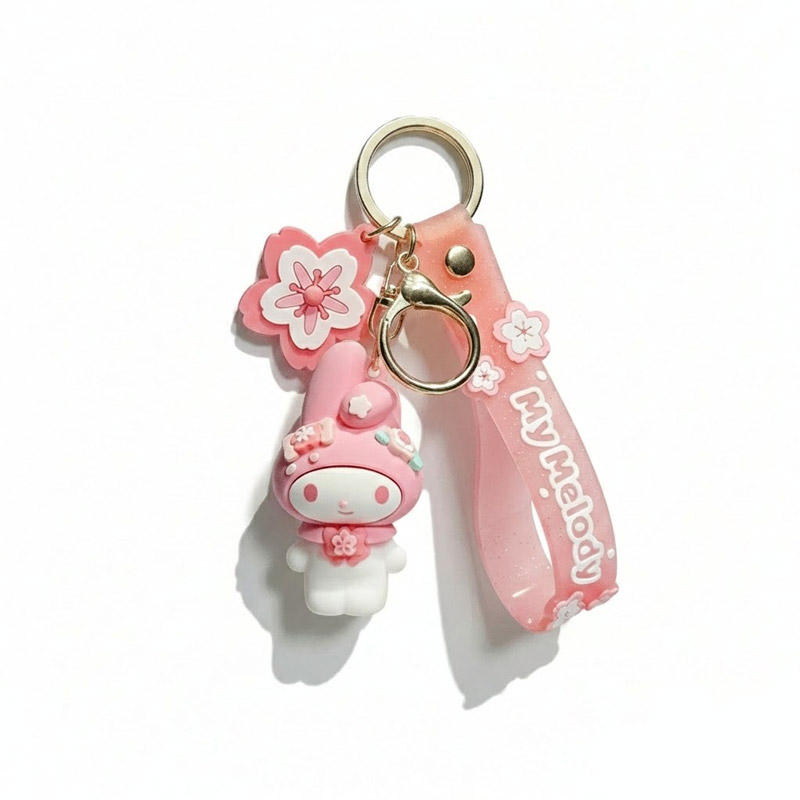 En pratique, ce porte-clé s’accroche en un geste grâce à son mousqueton doré robuste : trousseau de clés, fermeture éclair de sac à dos, anse de sac à main ou même trousse d’école. La dragonne en silicone souple estampillée “My Melody” et ornée de petites fleurs offre une prise confortable et empêche le porte-clé de glisser au fond d’une poche. Le charm fleur de cerisier en PVC plat ajoute du mouvement à l’ensemble sans alourdir le tout. C’est un accessoire du quotidien pensé pour être à la fois joli et fonctionnel.