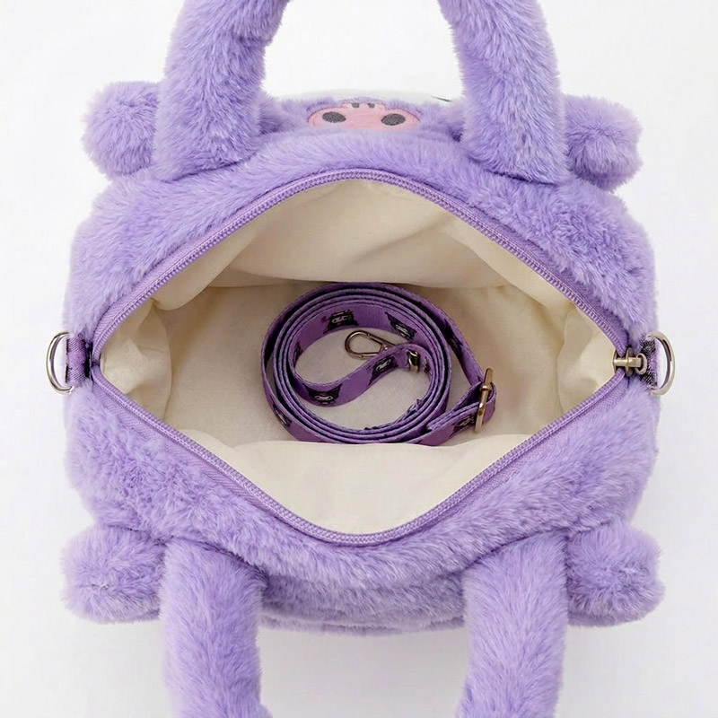 Ce sac à main peluche Kuromi arbore le violet profond et l’attitude espiègle du personnage rival de My Melody. La peluche est dense et agréable au toucher, avec un aspect velouté qui attire immédiatement la main. Derrière son look malicieux se cache un sac fonctionnel de 18 cm x 7 cm x 17 cm, équipé d’une fermeture éclair solide pour protéger vos effets personnels. La sangle détachable offre deux options de port, à la main pour un style chic ou en bandoulière pour plus de liberté de mouvement.