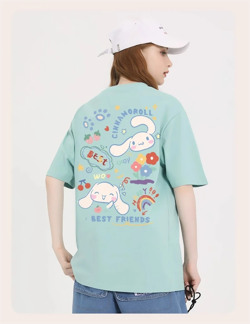 Ce T Shirt Cinnamoroll combine confort décontracté et esthétique kawaii grâce à une coupe oversize relaxée et un imprimé recto-verso plein de douceur. Sur le devant, un petit visuel discret de Cinnamoroll orne la poitrine gauche, idéal pour un style subtil au quotidien. Au dos, l’impression se déploie en grand format : Cinnamoroll apparaît entouré d’arcs-en-ciel pastel, d’étoiles scintillantes, de fleurs délicates et d’empreintes de pattes, avec le message “Best Friends” qui célèbre l’amitié et la bonne humeur. Les couleurs douces et lumineuses créent un contraste équilibré sur chaque teinte de tissu, du bleu ciel au rose poudré en passant par le violet lavande, le beige crème, le noir profond, le blanc immaculé et le vert menthe.